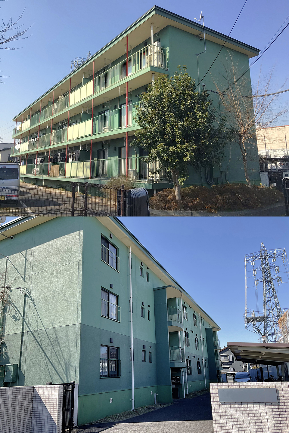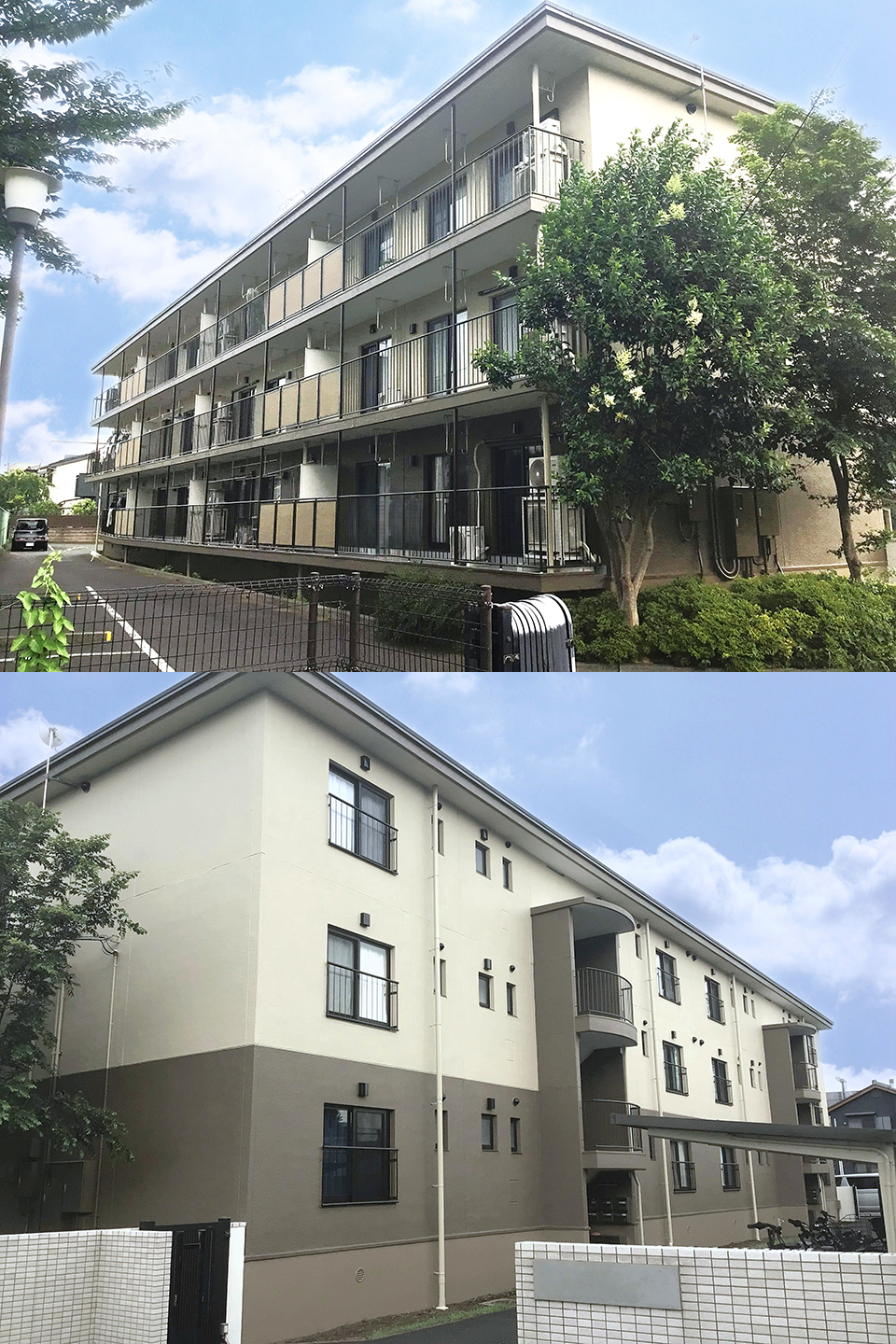 RC造賃貸マンションの外壁塗膜の劣化・色褪せや外壁の一部にクラックが発生し、屋上防水の劣化も進みはじめてきたため、外装の大規模改修を行いました。
